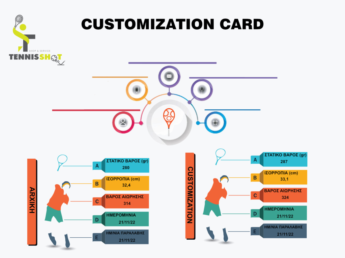 Στόχος της εξατομίκευσης ρακέτας (racket customization) είναι να έρθει η ρακέτα όσο πιο κοντά στο στυλ παιχνιδιού που εσείς επιθυμείτε ώστε να βελτιώσετε τα χτυπήματα σας. Η εξατομίκευση αυτή αφορά μόνο εσάς, σύμφωνα με τις δικές σας προσωπικές ανάγκες, με βάση το δικό σας προσωπικό στυλ παιχνιδιού και με βάση τη δική σας και μόνο ρακέτα. Ένας έμπειρος τεχνικός ρακετών, με τα κατάλληλα μηχανήματα και εργαλεία, μπορεί να σας βοηθήσει να έχετε τη καλύτερη απόδοση από τη ρακέτα σας, βοηθώντας σας να βρείτε το ιδανικό σας βάρος, την ισορροπία και το βάρος αιώρησης. Με το racket customization θα παραλάβετε το ειδικό έντυπο που θα αναγράφονται όλες οι λεπτομέρειες: