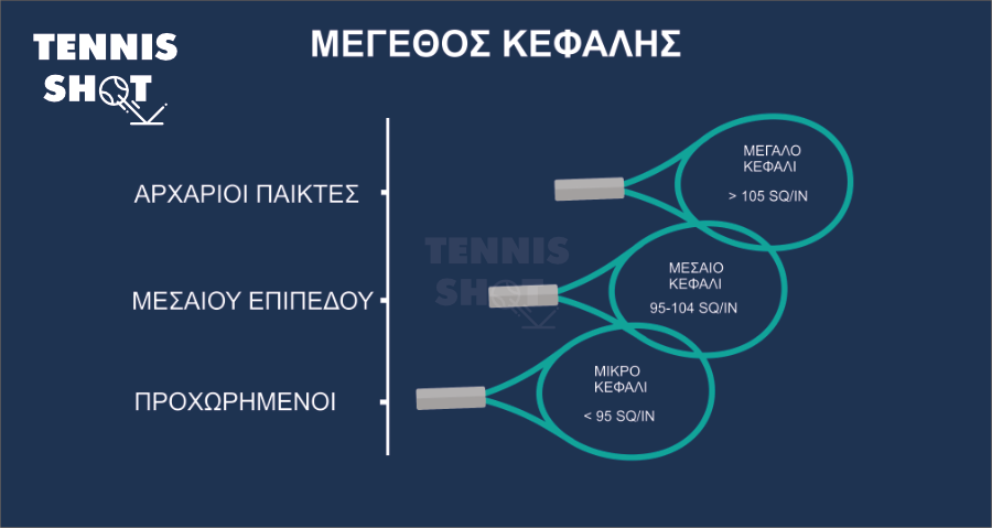 Οι σημερινές ρακέτες προσφέρονται σε μεγέθη κεφαλιού που κυμαίνονται από 93 έως 135 τετραγωνικά ίντσες, με το πιο συνηθισμένο να είναι το 97-100. Σε γενικές γραμμές, ένα μικρότερο κεφάλι απευθύνεται σε πιο προχωρημένους παίκτες που αναζητούν περισσότερο έλεγχο, ενώ οι μεγαλύτερες ρακέτες απευθύνονται στους αρχάριους και ενδιάμεσου επιπέδου παίκτες που αναζητούν περισσότερη δύναμη και μεγαλύτερο sweetspot.