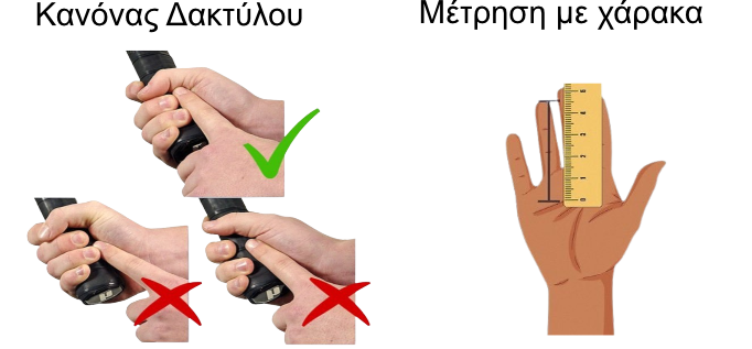 1. Κανόνας του δακτύλου: Κρατείστε τo grip με universal λαβή και το σωστό μέγεθος είναι αυτό στο οποίο ο δείκτης του χεριού σας χωράει εφαρμοστά ανάμεσα στη παλάμη σας και στα δάκτυλα του χεριού σας. Αν τα δάκτυλα ακουμπάνε τη παλάμη σας ή αν ο δείκτης δεν χωράει ανάμεσα τότε το grip είναι μικρό ενώ αν το κενό ανάμεσα στη παλάμη και στα δάκτυλα είναι μεγαλύτερο από ένα δείκτη το grip είναι μεγάλο.