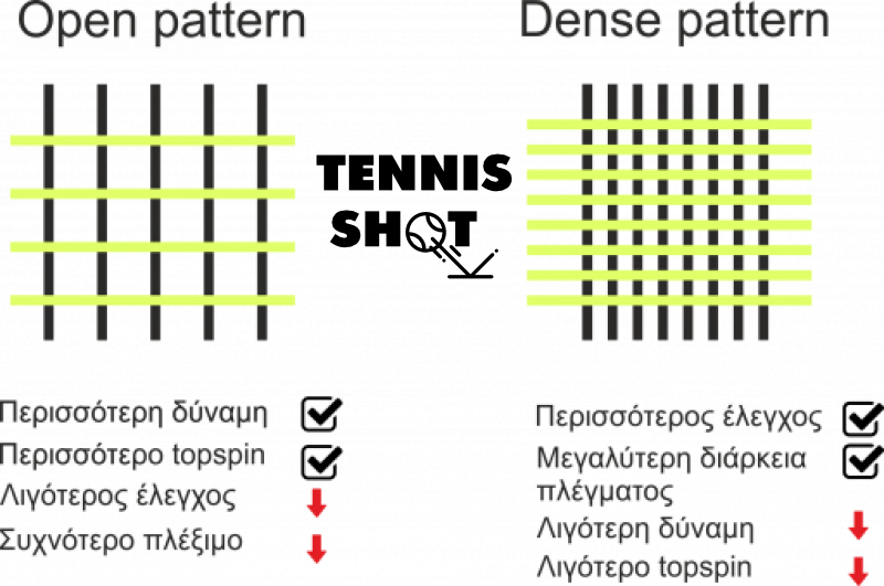 Το String pattern μιας ρακέτας αναφέρεται στον αριθμό των κάθετων (mains) και οριζόντιων (crosses) χορδών. Έτσι. μία ρακέτα με pattern 16×19 σημαίνει ότι έχει 16 mains και 19 crosses. Το string pattern αναφέρεται ως open pattern και dense pattern. Σε μία ρακέτα με dense pattern (18×20) η απόσταση μεταξύ των χορδών είναι μικρή ενώ σε μία ρακέτα με open pattern μεγαλύτερη.